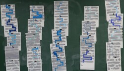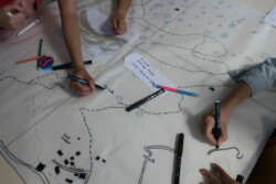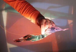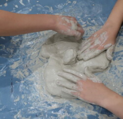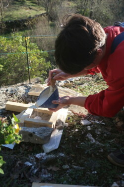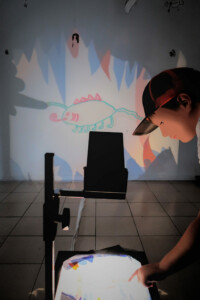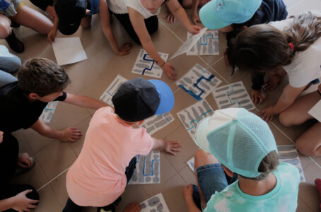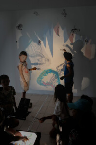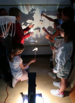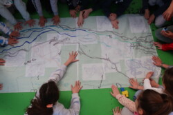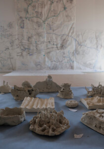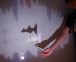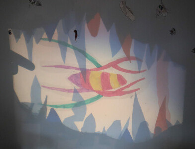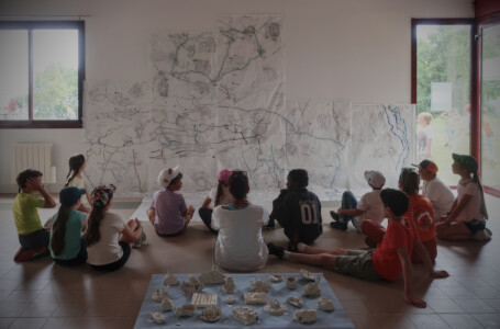 La première étape dédiée à la réalisation d’une cartographie collective est l’occasion d’interroger les différents reliefs du paysage et les itinéraires possibles ou rêvés de l’eau, à la surface et en profondeur. Dans un second temps les enfants expérimentent de manière sensible le mouvement de l’eau, avec divers procédés tels que le modelage de l’argile et le moulage du plâtre. Les plus grands imaginent un jeu inspiré de la bataille navale qui reflète la difficulté de l’eau à trouver son chemin parmi les pierres. La troisième phase du projet s’intéresse plus particulièrement aux habitants des grottes, à leurs sensations et à leurs formes. À l’aide d’un rétroprojecteur, les enfants sont invités à déambuler dans un espace lumineux peuplé d’une série d’animaux réalisés en origami, pour jouer avec les ombres et s’approprier l’obscurité des cavités.